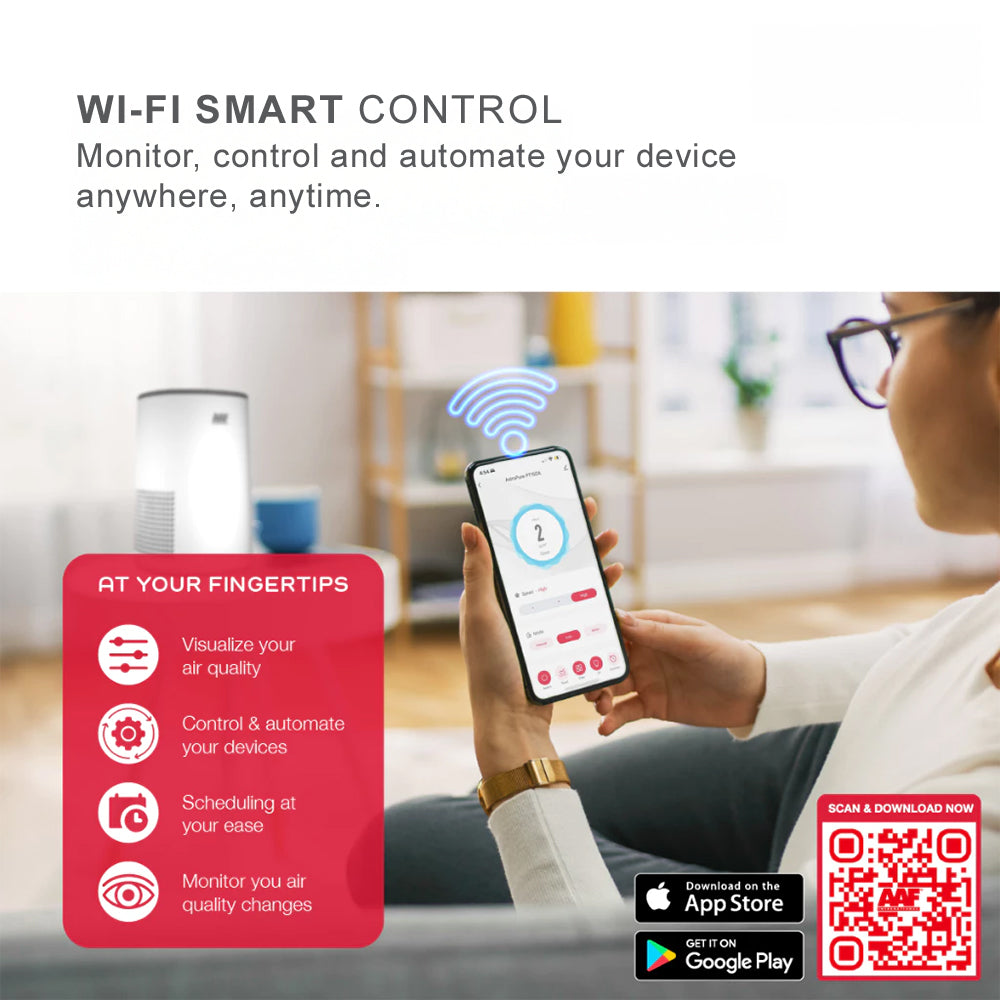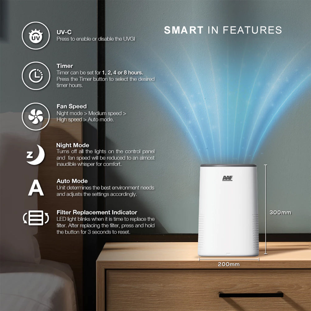 Breathe clean, live smart. The AAF AstroPure PT150A is your compact solution for healthier indoor air. Engineered with True HEPA H13 filtration, activated carbon, and UVC disinfection, it removes up to 99.95% of airborne particles including dust, pollen, allergens, smoke, and microbes — all while looking sleek and fitting effortlessly into your space.