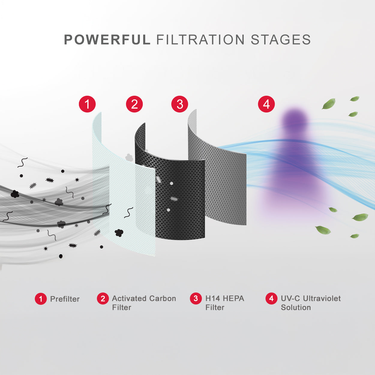 · Ultra‑High Filtration (H14 True HEPA): Captures up to 99.995% of ultrafine particles, including pollen, haze, and even PM1 pollutants.