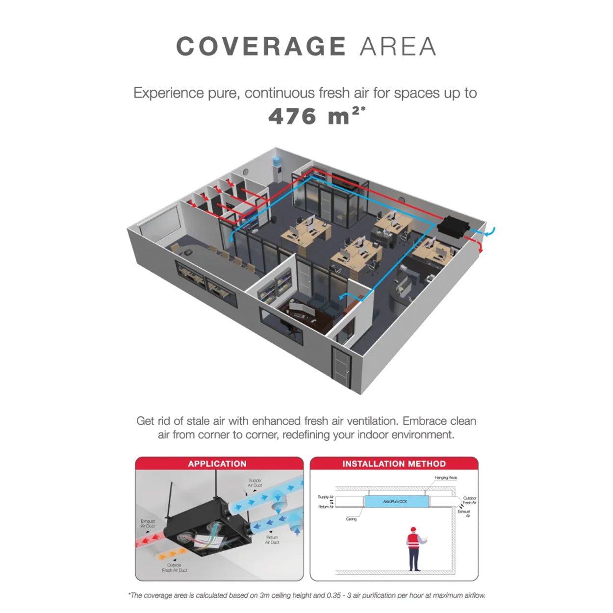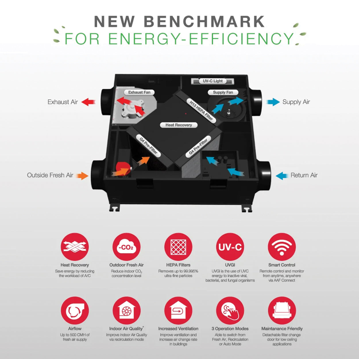 The AstroPure CCX500A from AAF’s CCX Series is a premium fresh-air purifier that delivers hospital-grade filtration, smart monitoring, and energy-saving heat recovery—all in one sleek unit.